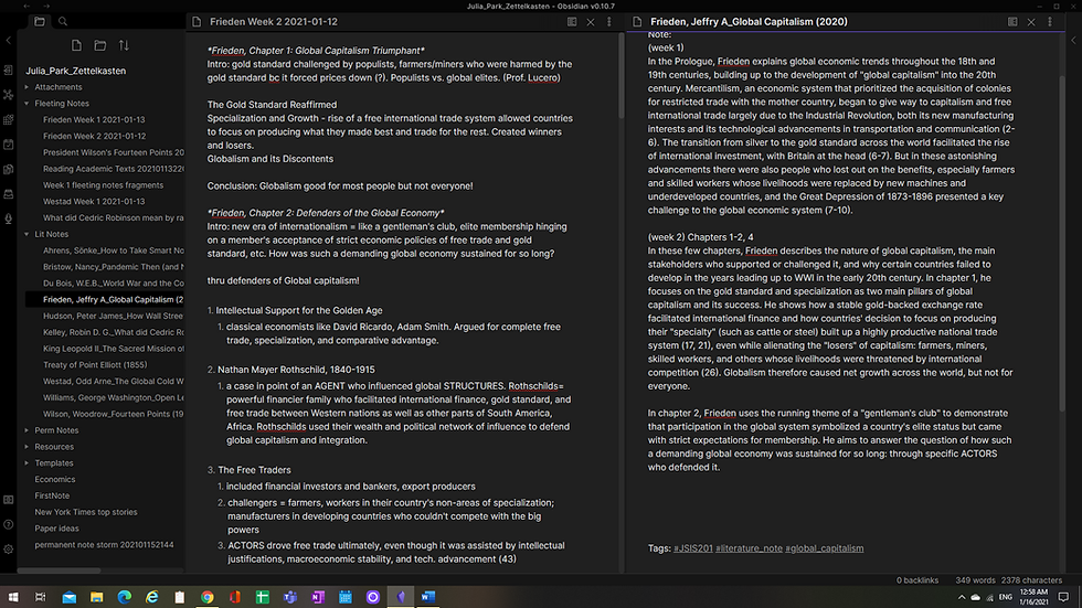 So what is the Zettelkasten, you ask? Essentially, it is a system for organizing notes that is conducive to making connections between ideas and forcing you to actually THINK about what you're learning, not just copy down information. The way I learned it, notes are divided into fleeting, literature, and permanent notes. Fleeting notes are just basically your chicken-scratch thoughts on paper. They can be messy and make no sense as long as they're intelligible to you, and they're meant to be thrown away later after you use them as a reference to write your permanent notes. Permanent notes are basically a nicely-written, clear original idea that you elaborate on in a paragraph or so. They spring from making connections between previous notes and/or the reading or academic material you're studying, etc. Because writing permanent notes forces you to look back at your fleeting notes and think carefully about the connections that can be made, they're great prep for writing essays and written assignments, since you're essentially writing little chunks of good writing that could potentially find their way into your paper (edited, of course). Literature notes are just summaries of each text or source you read so that you have a record of what they're about. Ahrens' book does a great job of explaining the rest, as the system is rather complicated, but once you get the hang of it it is just wonderful. Our instructor taught us how to use Obsidian, a free software you can find online, to organize our Zettelkasten and create a sort of digital note system, as originally the system was designed for physical notecards and paper.
